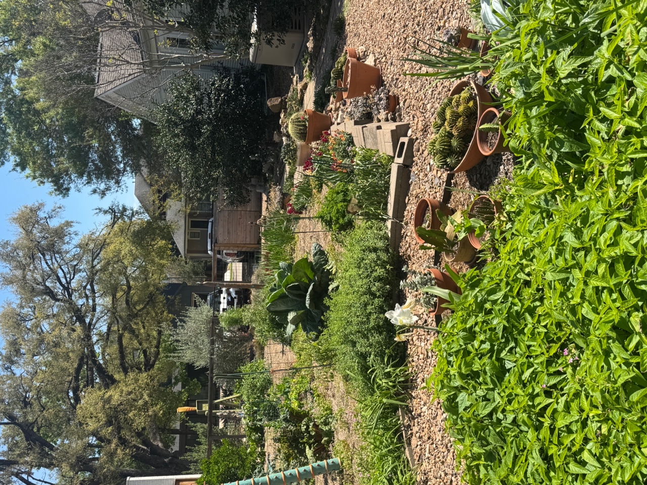 In the side yard, David makes the most of the full sun. He grows a little bit of everything-tomatoes, parsley, cilantro, kale, chard, collards, okra, eggplant, green beans, tangerines, and lemons. It's the kind of garden that feels lived in, loved, and evolving.